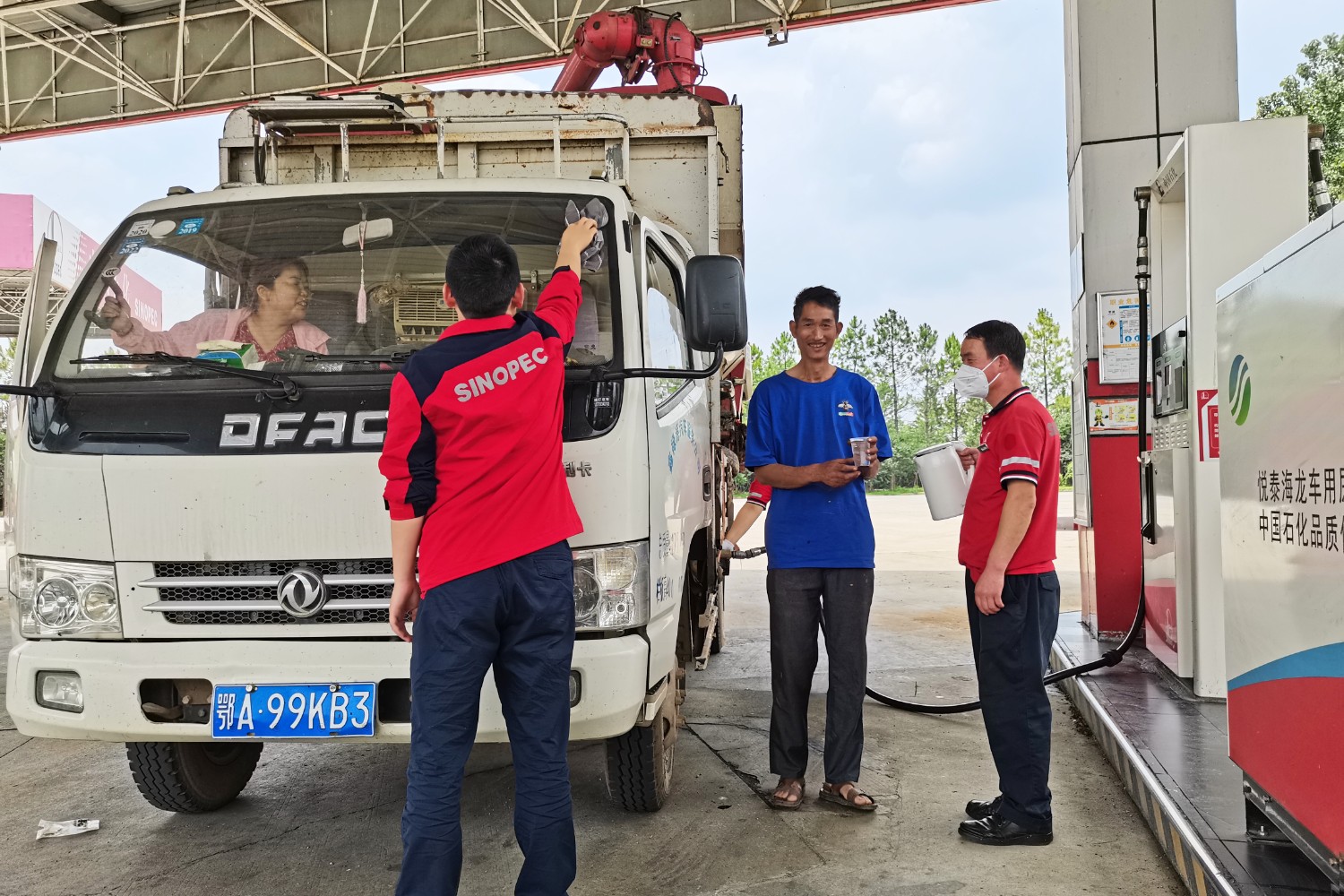 息縣服務(wù)區(qū)加油站設(shè)置專用加油通道,為機(jī)收車輛駕駛員送上飲用開水,幫助擦拭車輛玻璃。