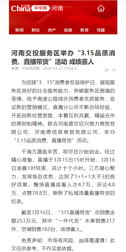 中華網(wǎng)、中原網(wǎng):河南交投服務(wù)區(qū)舉辦“3.15品質(zhì)消費(fèi)、直播帶貨”活動(dòng) 成績(jī)喜人