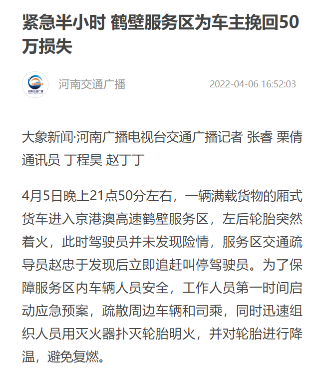 河南交通廣播:緊急半小時(shí) 鶴壁服務(wù)區(qū)為車主挽回50萬損失