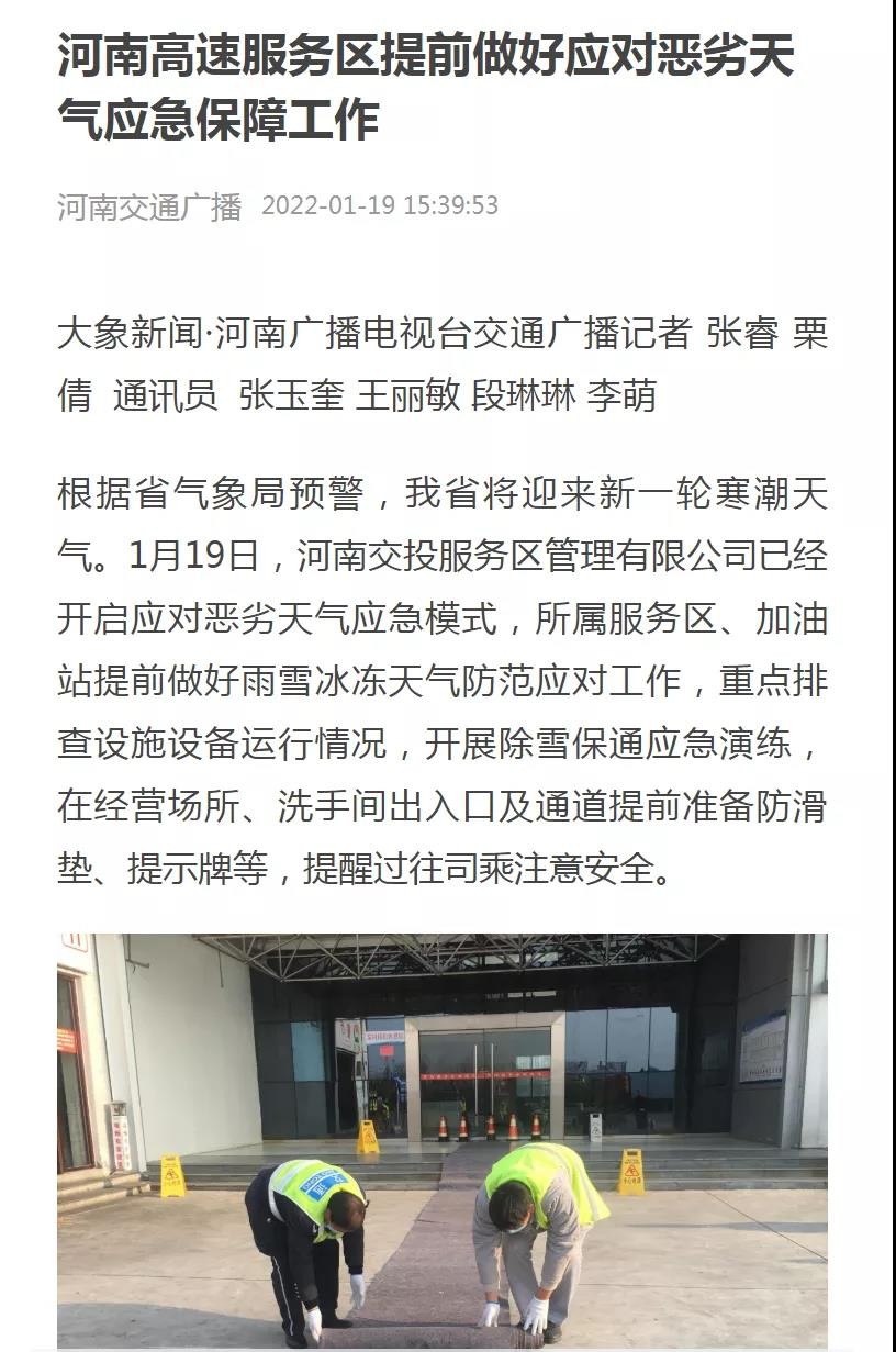 “河南交通廣播”:河南高速服務(wù)區(qū)提前做好應(yīng)對惡劣天氣應(yīng)急保障工作