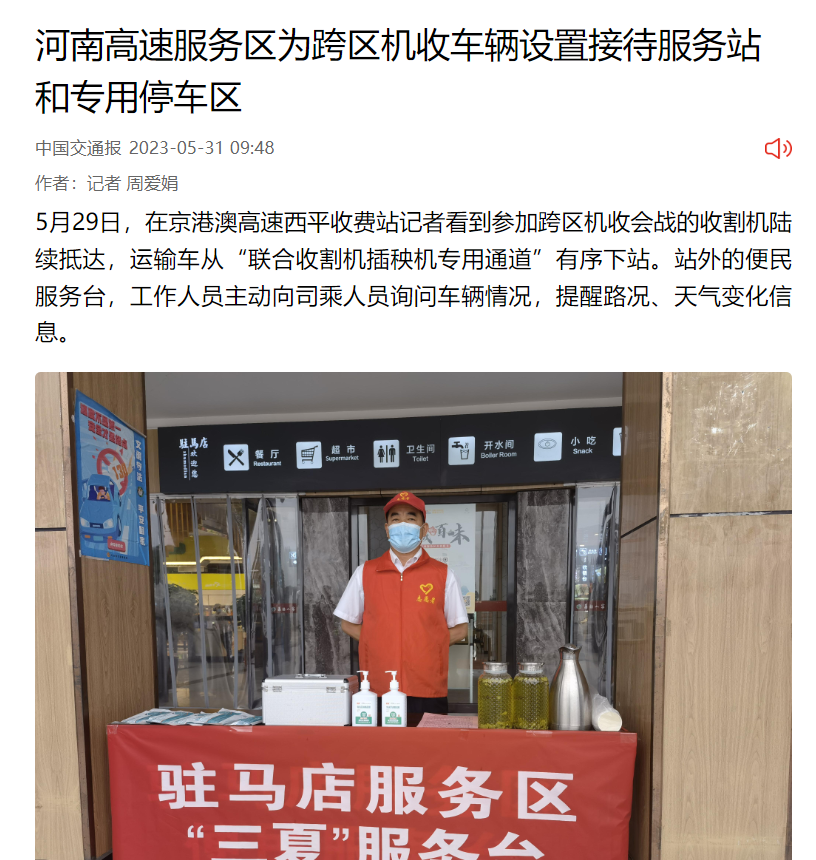 中國交通新聞網(wǎng):河南高速服務(wù)區(qū)為跨區(qū)機(jī)收車輛設(shè)置接待服務(wù)站和專用停車區(qū)